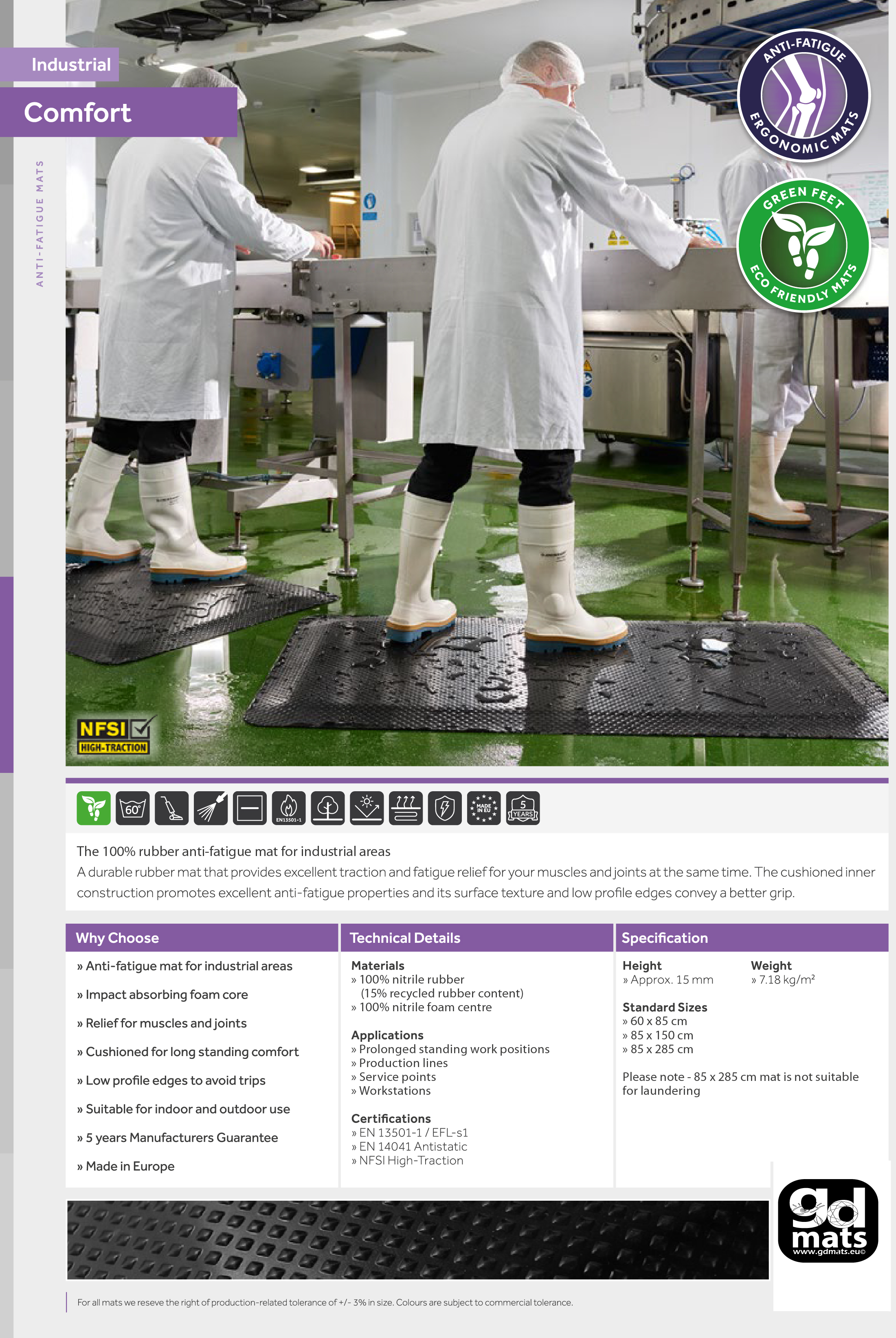 - Rohožka z rady Comfort je odolná gumená podložka, ktorá poskytuje vynikajúcu trakciu a zároveň úľavu od únavy pre vaše svaly a kĺby. Odpružená vnútorná konštrukcia podporuje vynikajúce vlastnosti proti únave a jej povrchová štruktúra a nízke profilové hrany poskytujú lepšiu priľnavosť a znižujú riziko pošmyknutia alebo zakopnutia na pracovisku.