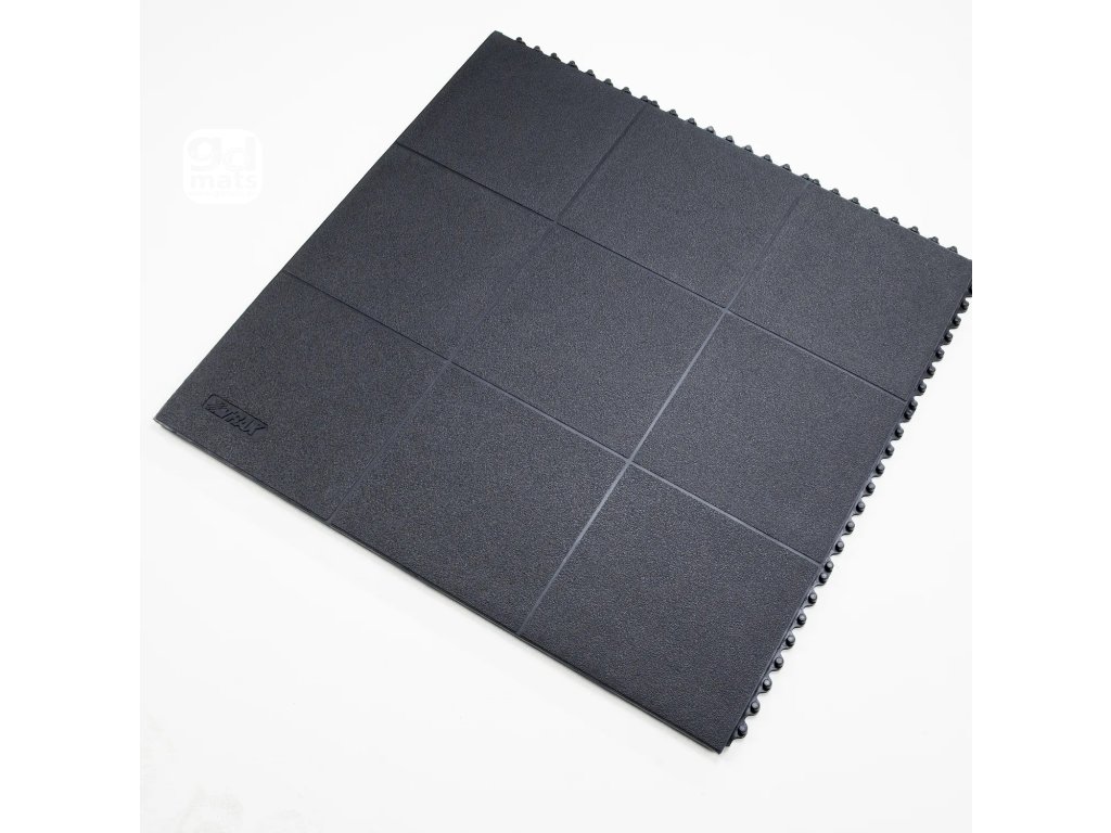 Modulárna rohož poskytuje ergonomický benefit vďaka 19 mm hrubej pracovnej plošine s uzavretým protišmykovým povrchom s kamienkovým vzorom pre maximálne pohodlie a zníženie únavy v suchých priemyselných prostrediach.