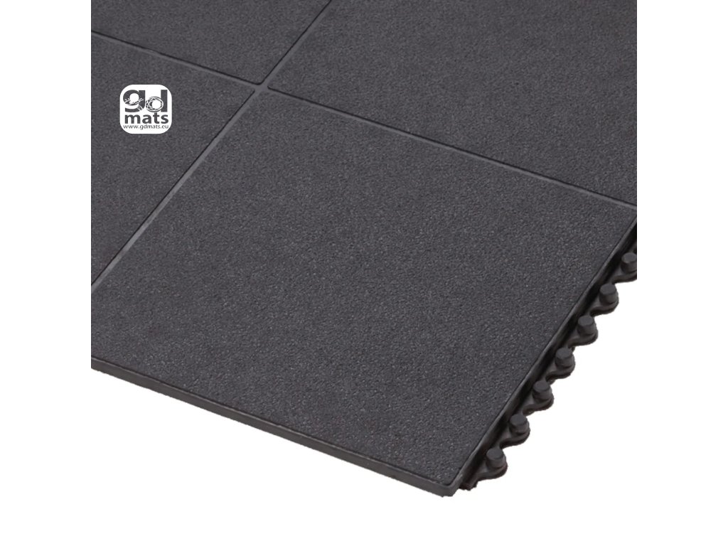 - Odolné gumové dlaždice veľkosti 91 cm x 91 cm možno jednoducho zostaviť pre pokrytie veľkých plôch alebo jednotlivých pracovísk, od steny k stene alebo ako ostrovy
