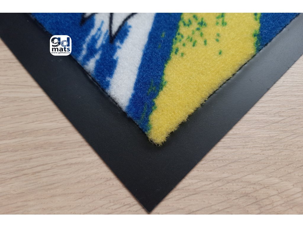 Das Design der Fußmatte entsteht nach Ihrer eigenen Fantasie, die Fußmatte kann in jeder Farbkombination mit Text, Logo oder Grafiken auf Bestellung angefertigt werden.