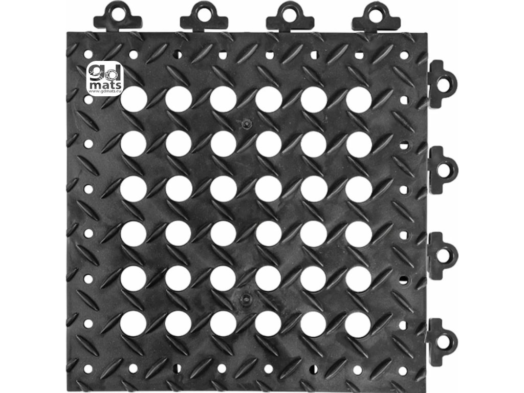 Kivételes fáradtságcsökkentés az alsó rész egyedi "flex" kialakításának köszönhetően. Elérhető előre összeszerelt vagy egyedi csempeként, helyszíni beépítéshez. Az állandó zárrendszer biztosítja, hogy a szőnyeg ne essen szét. Ragasztás nem szükséges. Egyszerűen telepíthető a helyszínen az egyedi konfigurációkhoz. Csúszásmentes felület műszerfali kialakítással, a DIN51130 és a BGR181 BG szabály szerint tesztelt R10. A 22 mm átmérőjű kerek furatokkal ellátott vízelvezető rendszer megkönnyíti a folyadékok és szennyeződések eltömődés nélküli elvezetését a munkaterületről, így a felület tisztán tartható. A tartós PVC csempe védi a padlót és csökkenti a fáradtságot. Alakja és méretét tekintve ideális padlószőnyeghez szabható. A biztonságos mozgáshoz tervezett csúszásgátló felületek.