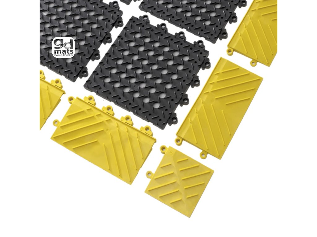 Kivételes fáradtságcsökkentés az alsó rész egyedi "flex" kialakításának köszönhetően. Elérhető előre összeszerelt vagy egyedi csempeként, helyszíni beépítéshez. Az állandó zárrendszer biztosítja, hogy a szőnyeg ne essen szét. Ragasztás nem szükséges. Egyszerűen telepíthető a helyszínen az egyedi konfigurációkhoz. Csúszásmentes felület műszerfali kialakítással, a DIN51130 és a BGR181 BG szabály szerint tesztelt R10. A 22 mm átmérőjű kerek furatokkal ellátott vízelvezető rendszer megkönnyíti a folyadékok és szennyeződések eltömődés nélküli elvezetését a munkaterületről, így a felület tisztán tartható. A tartós PVC rácspanelek védik a padlót, miközben csökkentik a fáradtságot. Egyedi méretben és alakban az ideális padlószőnyeghez készült. Csúszásgátló felületek a biztonságos mozgáshoz. Levágott rámpák állnak rendelkezésre az elbotlás veszélyének kiküszöbölésére, és könnyű hozzáférést biztosítanak a szőnyeg felületéhez és onnan.
