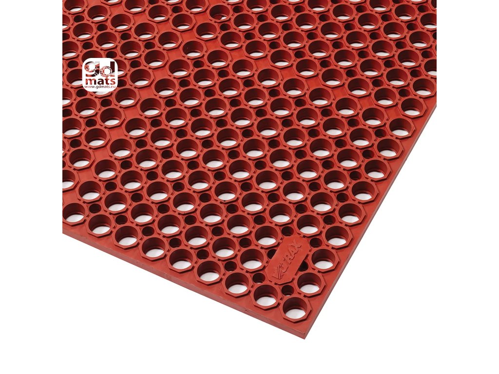 563RD Sanitop Deluxe™ Red je rohož, ktorá sa nevyznačuje len svojou nehybnosťou vďaka značnej hmotnosti, ale poskytuje aj ergonomický prínos prostredníctvom 20 mm hrubej pracovnej plošiny. Veľké drenážne otvory a vyvýšené výstupky zabezpečujú vetranie a umožňujú tekutinám a nečistotám prepadávať, čím udržiavajú povrch čistý. K dispozícii sú zosikmené nábehové hrany, ktoré znižujú riziko zakopnutia.